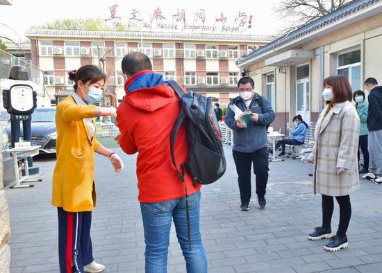 今日一早,黑芝麻胡同小学优质教育资源带的家长们陆续到校取教材。为了避免家长在校门口聚集,学校专门发出了5份通知,保障“无接触”发教材。该校老师举例,因为学校学生数量较多,所以不仅按年级和班级分别制定了领取教材的时间,而且还在不同校区都设置了领取点。