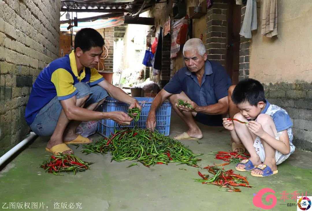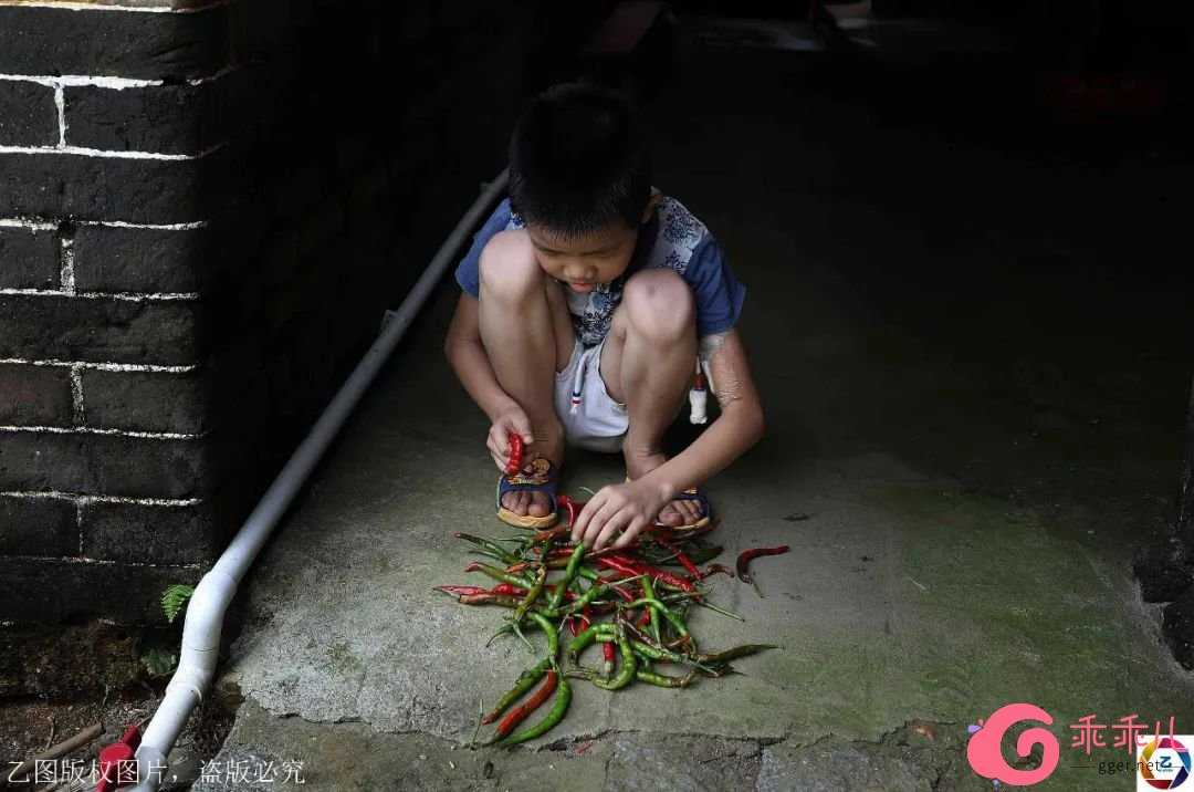 黄雪娟和丈夫努力想把日子过得好一点,从2008年开始,夫妻俩掏出家里全部积蓄3万元,又借了5万元开始养猪,可没想到30多头猪养到200多斤时,一场猪瘟让他们亏得血本无归。2011年,夫妻俩重整旗鼓,开始做起卖水果的小生意,到后来又借钱去养鸡,最后都是以亏本结局。而黄雪娟自己早年因故右眼意外失明,一直都没钱医治。图为陈子泽爸爸和爷爷采摘辣椒。