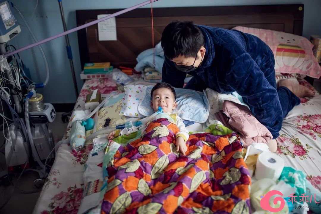 孙名熙的父亲帮他翻身,SMA患儿需要不停更换躺着的姿势,防止脊柱侧弯