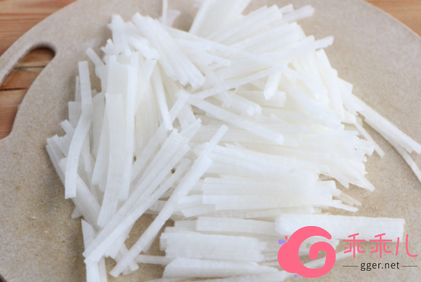 1、首先把洗干净的白萝卜和老姜切成细丝。注意白萝卜不需要去皮,如果孩子体内寒气比较重姜可以把外面的皮去掉,这样效果会更好。